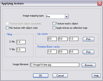影像檔案名稱 你可以在此設定要使用在選取物件上的材質影像路徑。你可以在文字方塊中直接鍵入影像或者點擊瀏覽按鈕開啟 Windows 標準的「瀏覽檔案」對話方塊並透過目錄結構尋找材質檔案的位置。材質檔案必須是 .bmp 或 .jpg。
